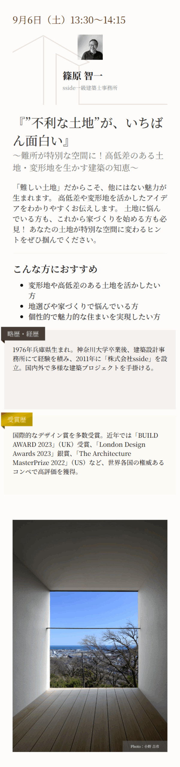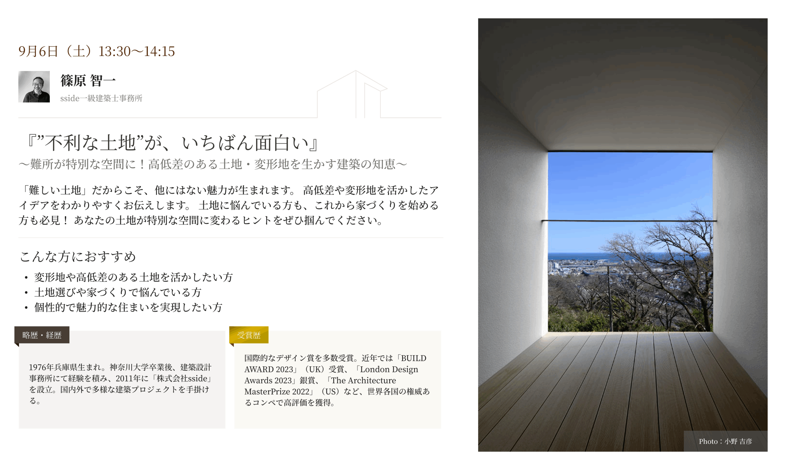 検討中の敷地資料をご持参いただければ、各建築家へ個別相談をしていただくこともできます